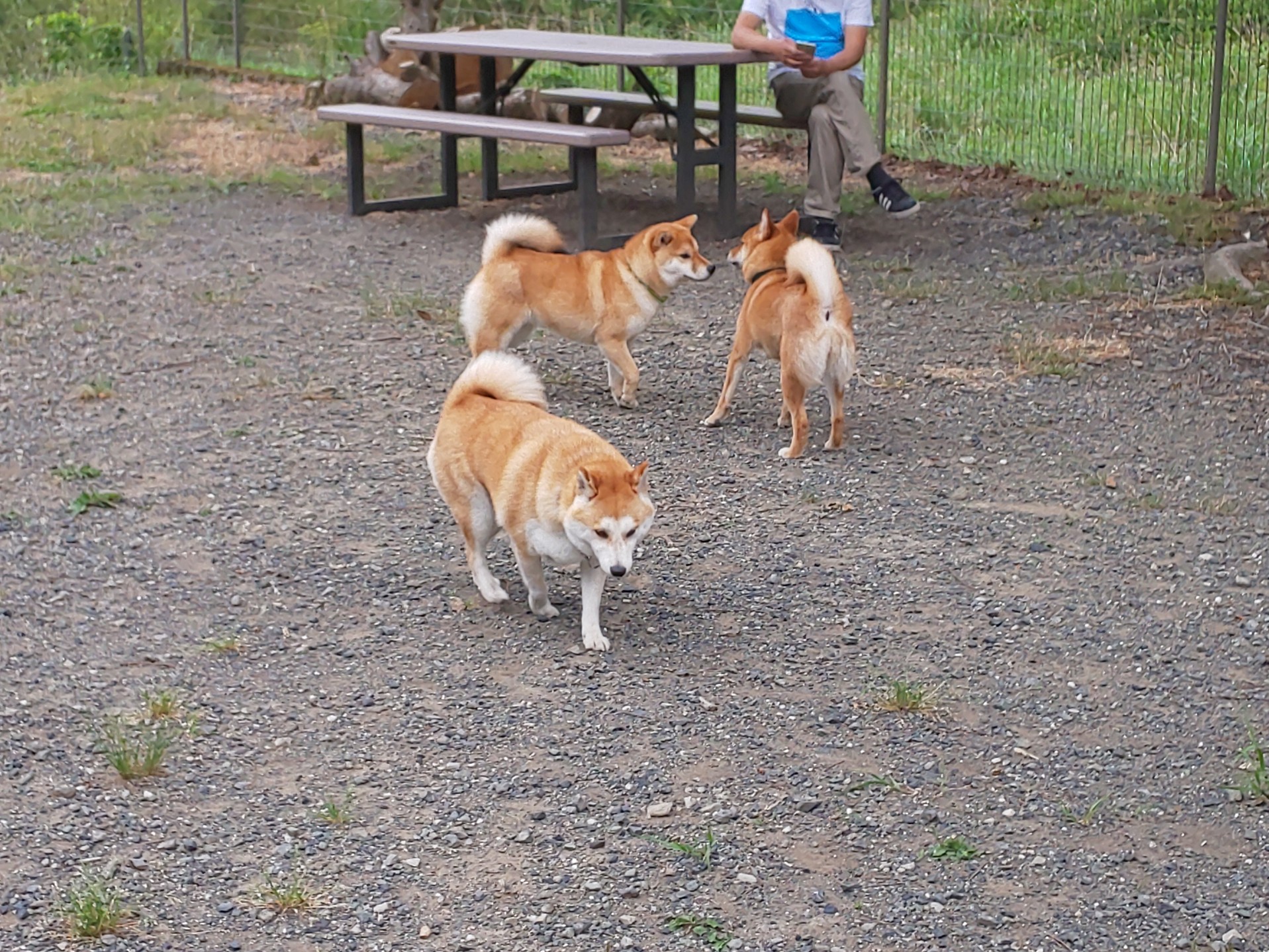 ONESTARの看板犬、すずちゃんが、柴犬だけがいるドッグランで他の柴犬と戯れる様子