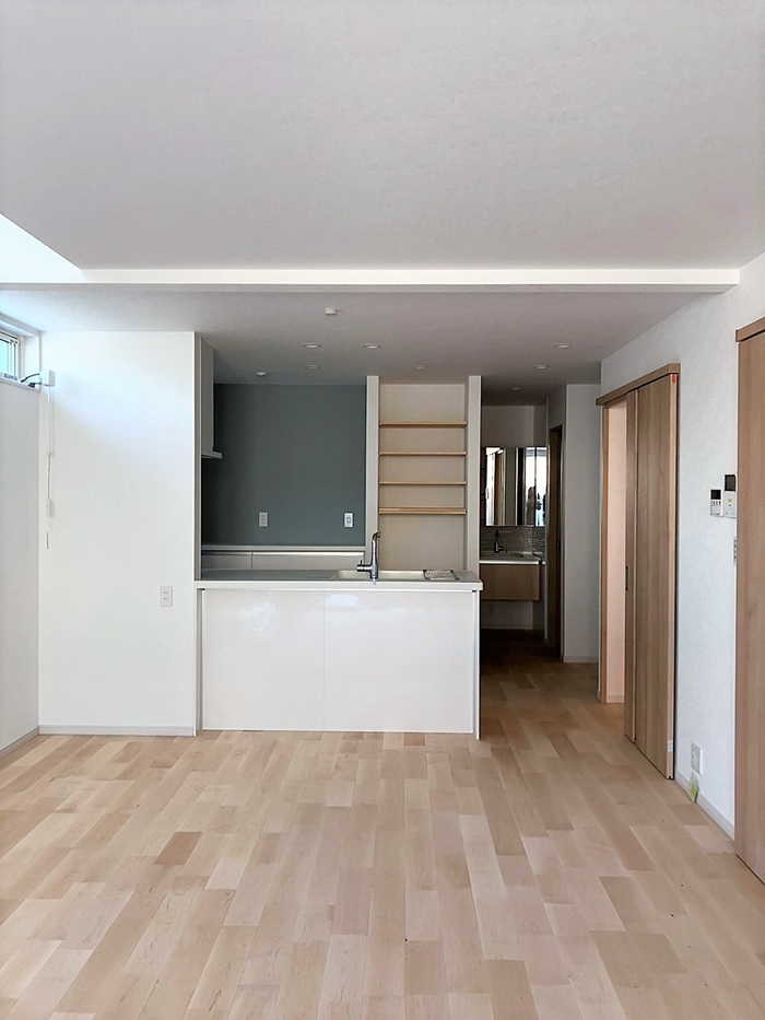 (▶オープンキッチンのLDK★メープル無垢の床が美して木のぬくもりを体で感じられる空間です♪)
