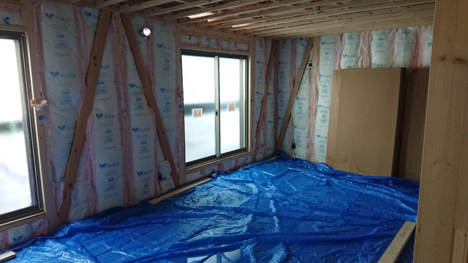 外部に接する面には断熱材を入れ、軒天下地を仕上げました。