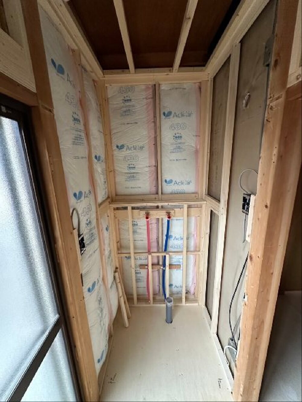 隣家と近接しているため、寝室の壁はもとの壁より少しふかして、間柱間にロックウールを入れています。ロックウールには断熱効果と、吸音効果があります。