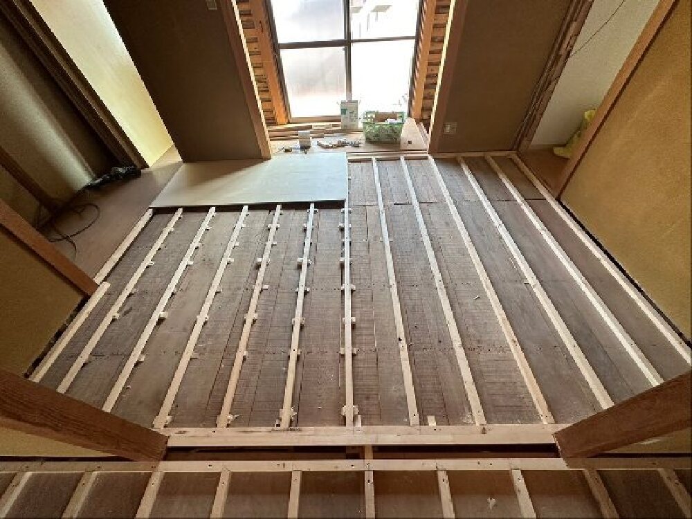 二階はフロアタイル仕上げとなります。もとともタタミだった部分を木下地にて高さを上げて廊下との段差をなくした後フロアタイルを貼ります。