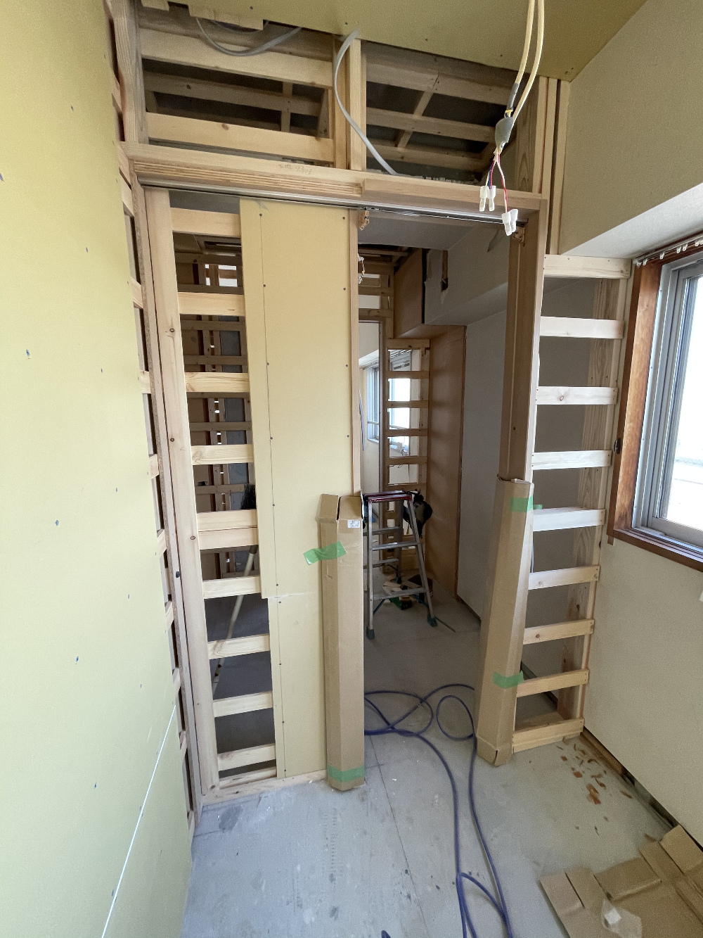 解体が終わると間仕切り壁を作っていきます。あっという間に8畳の和室から物干し室、WIC、畳コーナーの壁がたっていきます!