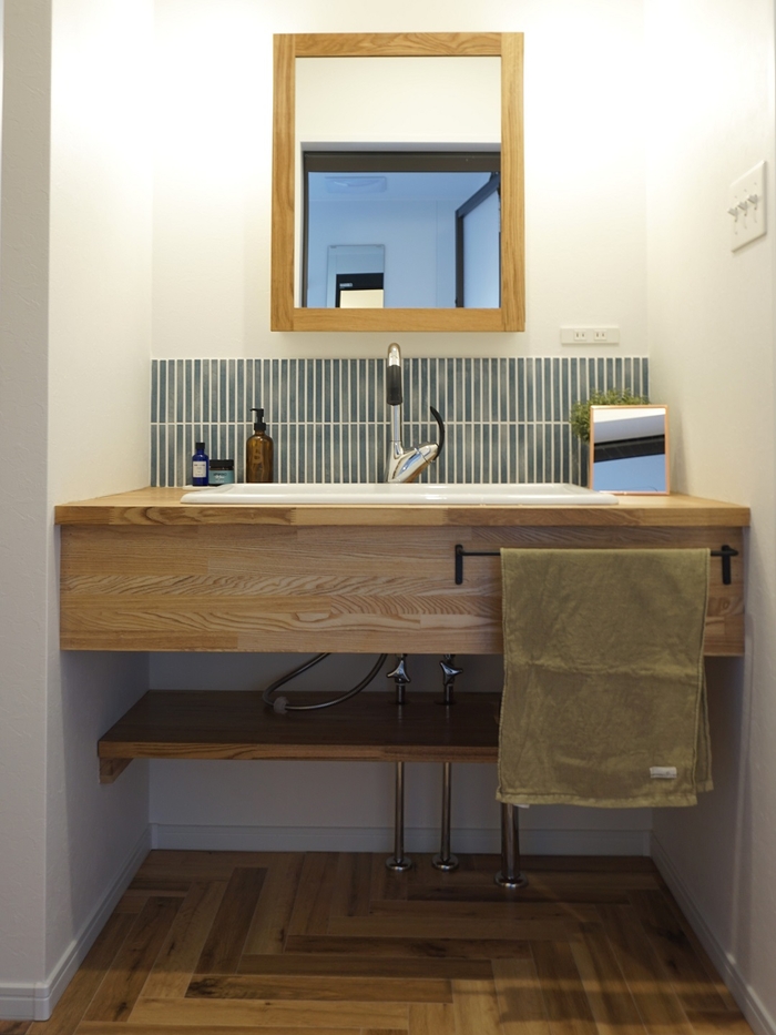お料理好きの奥様のために、キッチンもお気に入りのものを採用。キッチンから家事コーナーを抜けたところに、お子様のお昼寝もできる「畳コーナー」を新設。お料理、お洗濯、掃除、などの家事をスムーズに進められるような動線を反映した、快適でおしゃれなお家ができました。