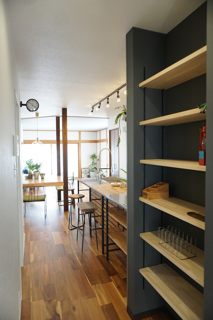 お子様が多い毎日は、家事も子育ても大忙し。子供たちのモノでつい足もとが散らかりがちなリビングも、スッキリ暮らすために間取りを一から見直されました。「独立した和室」をなくして「広いLDK」へ。新しさを取り入れつつ、既存の「和」のお家の良さも活かした名残は、リビングの真壁づくりに見ることが出来ます。構造上どうしても取る事ができない柱は、ダイニングテーブルの脚として活かしています。