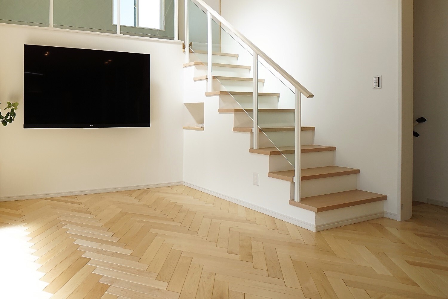 通常の2階建てであれば、壁掛けテレビの奥は玄関ですので、こんなに広がりがあるように見えないのですが、