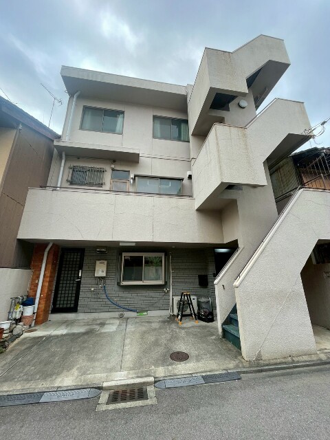 階段は既存を利用するため、養生材を貼り傷つけないように養生しています。