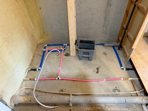 洗面台の背面をふかし、配管スペースとします。パイプからの音を防止するため防音材が巻いているパイプを使用しています。